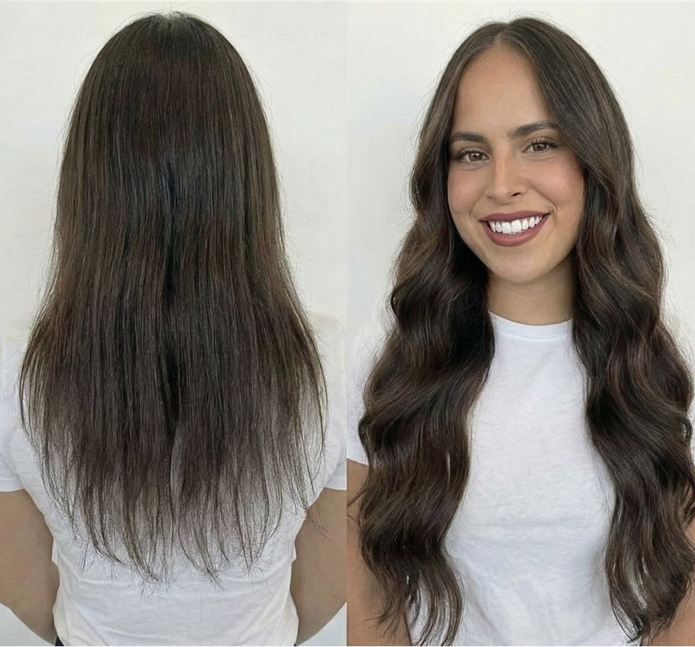 That’s why we designed a “clip in” to mimic our mini professional weft. Our custom product; Volume Clip ins. Whether you are having a break from semi-permanent track extensions or your sick of the uncomfortable clip in feeling from your bulky wefts- these have been designed for YOU!